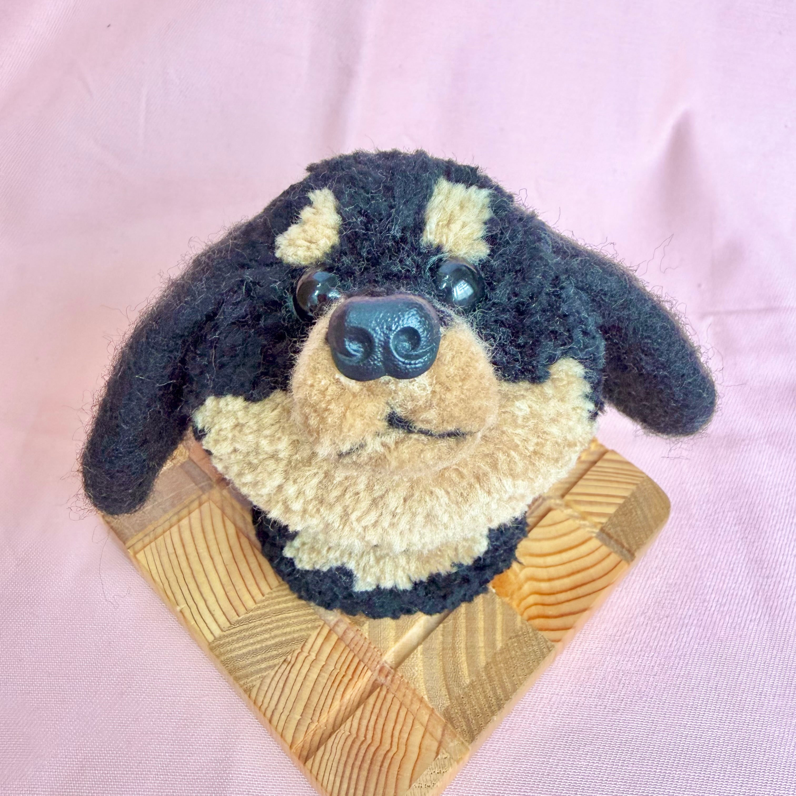 毛糸でできた置き型わんこ:見上げているダックスフント(ブラックタン)